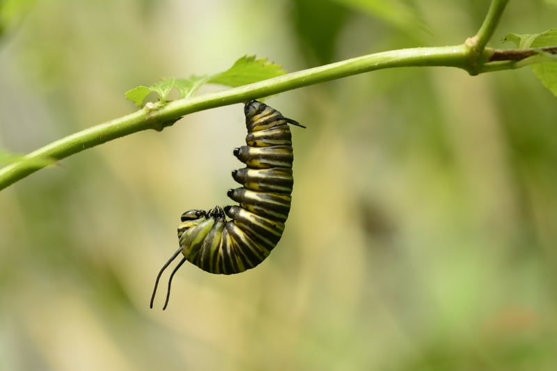 A monarch caterpillar preparing to transform into a chrysalis.