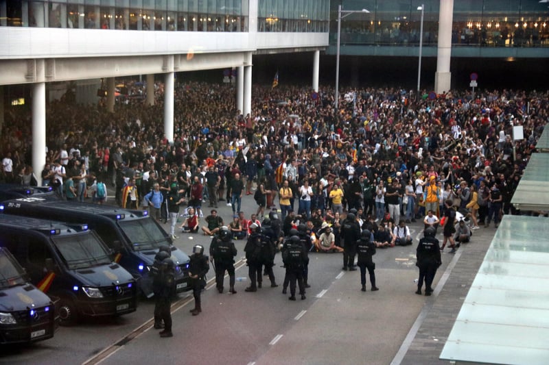 Pro-Catalan protesters hold a mass demonstration at the Barcelona-El Prat Josep Tarradellas Airport on Oct. 14, 2019.