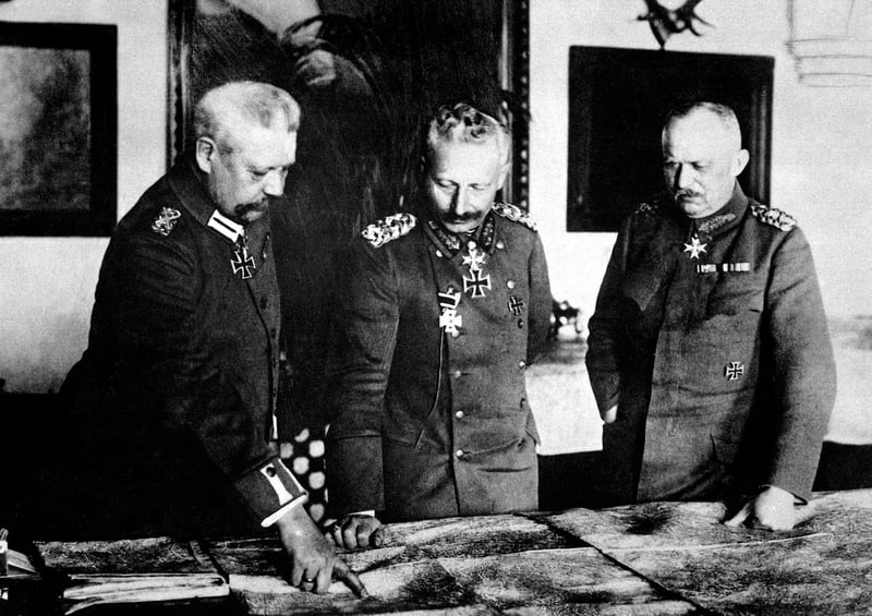A nation of iron. Paul von Hindenburg, Kaiser Wilhelm II and Erich Ludendorff, each wearing an Iron Cross, reviewing troop movements during World War I. U.S. National Archives, NARA 99-02150 (public domain), via Wikimedia Commons