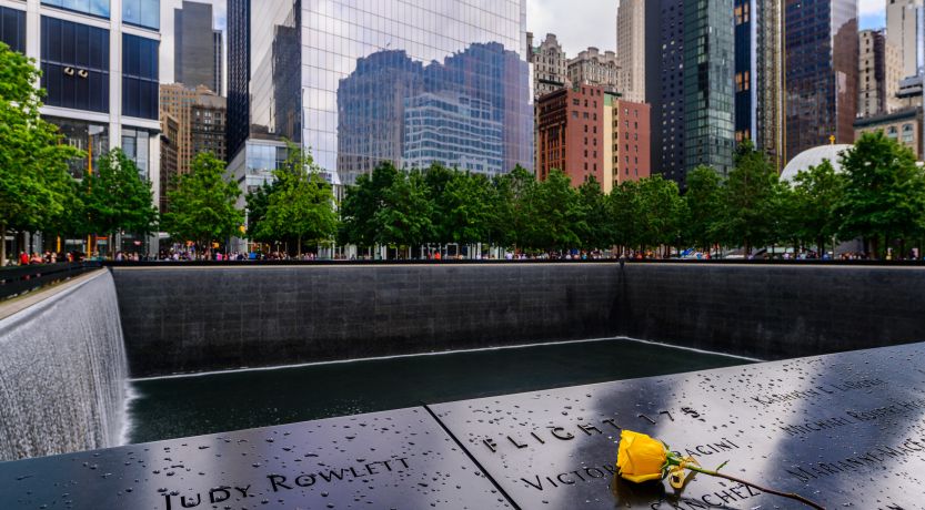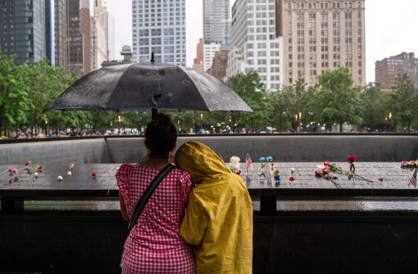 Onlookers observe the 9/11 memorial in New York City.